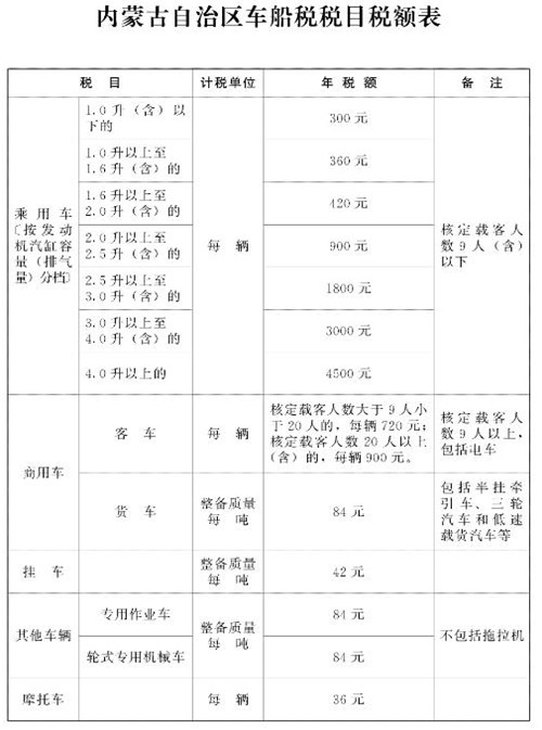 第三条 车船税的税目、税额,按照本办法所附《内蒙古自治区车船税税目税额表》执行。