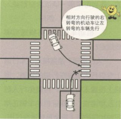 (六)相对方向行驶的右转弯的机动车让左转弯的车辆先行。