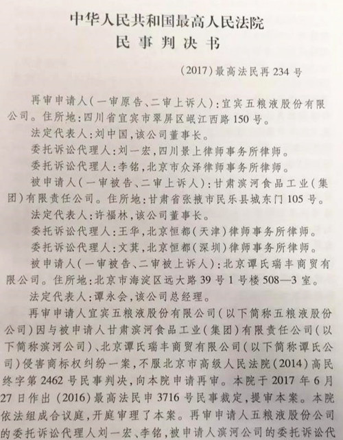 2017年11月23日,“九粮液”、“九粮春”案件在最高人民法院开庭审理。