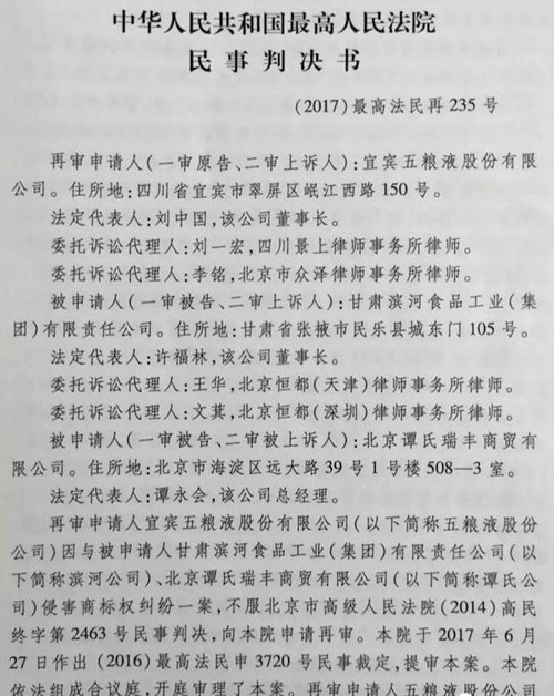 人民日报讯 近日,四川景上律师事务所主任刘一宏律师代理的宜宾五粮液股份有限公司(以下简称五粮液集团)诉甘肃滨河食品工业(集团)有限责任公司(以下简称滨河集团)等侵害商标权案,最高人民法院再审判决滨河集团生产、销售“九粮液”、“九粮春”酒产品的行为构成对五粮液集团的“五粮液”、“五粮春”商标侵权,并判令滨河集团赔偿五粮液集团损失900万元且在《中国知识产权报》上刊登声明,消除影响。至此,本案在备受争议的情况下,历经北京一中院、北京高院、最高院三级法院审理,五粮液集团在一审、二审败诉的情况下,再审最终胜诉。该案的胜诉,对于我国傍名牌类商标侵权案件的审理具有里程碑意义,彰显了我国知识产权司法保护的力度和决心。