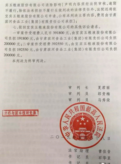 五粮液集团不服该一审判决,于2014年2月向北京高院提起上诉,北京高院于2016年5月作出终审判决:驳回上诉,维持原判!