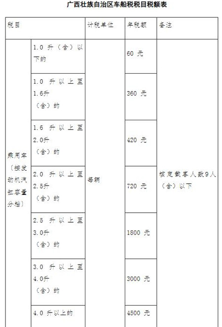 第三条 车船税的适用税额,依照本办法的附件《广西壮族自治区车船税税目税额表》执行。