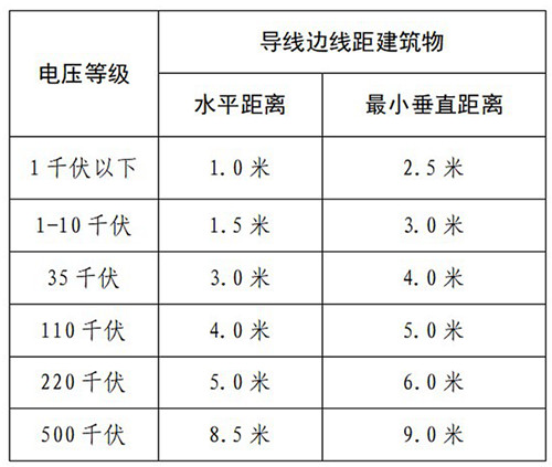 在厂矿、城镇等人口密集地区,各级电压导线边线在最大计算风偏或最大计算弧垂的情况下,距建筑物的安全距离如下: